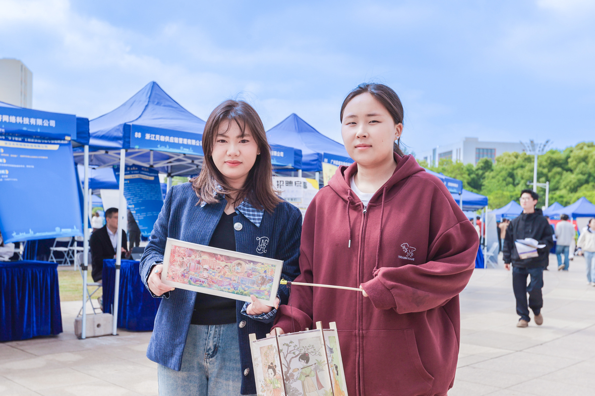 艺术设计类专业的学生同样用作品说话。创意设计学院的叶婉怡、万佳怡分别带着校园插画、手提宫灯等设计作品到场,希望借此展示自己的设计能力。