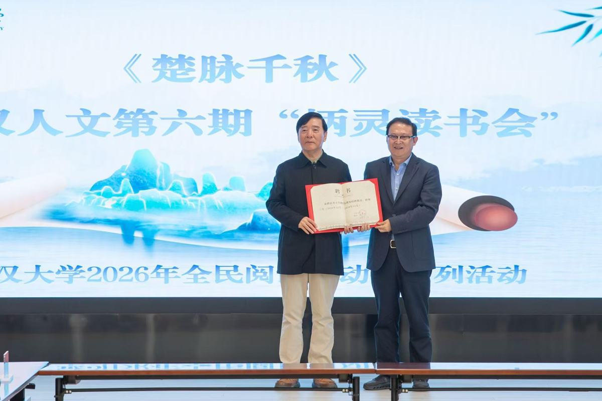 4月24日,江汉大学2026年全民阅读活动周系列活动之“江汉人文·炳灵读书会”在行政楼216会议室举行。校党委书记覃道明出席活动,并为《荆楚千秋》主编、学校特聘教授刘玉堂颁发聘书。