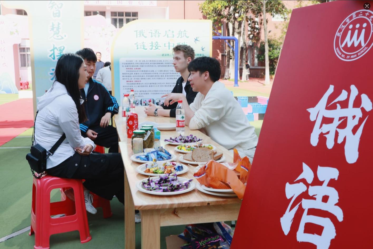 春日暖阳下,校园里处处是青春活力的身影,每个展区都藏着少年成长的无限可能。国际文化体验区前人气最旺,俄罗斯外教帕维尔、西班牙语外教杨诗韵的趣味口语课堂吸引了不少学生驻足互动。一旁的美食品鉴和文创展示,让大家不出校园便能感受多元文化氛围。