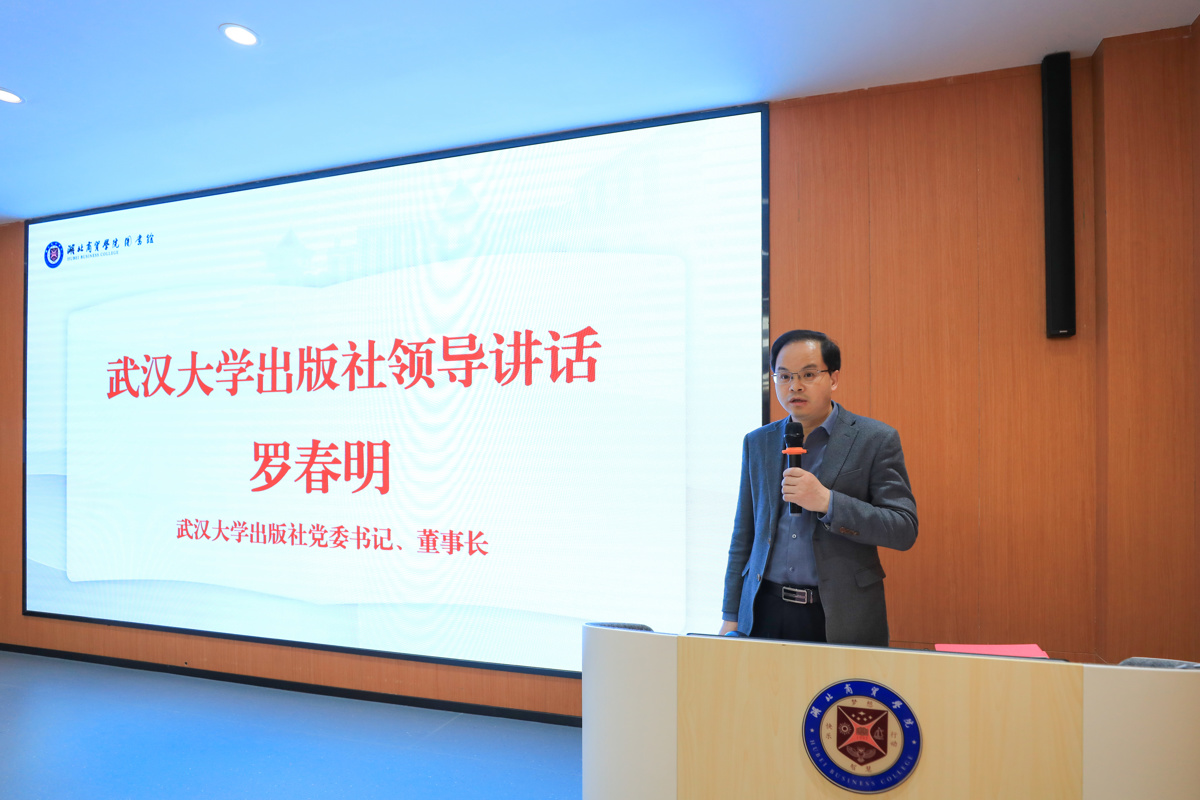 罗春明在讲话中表示,湖北商贸学院长期重视校园文化建设,积极营造“爱读书、读好书、善读书”的浓厚氛围,与武汉大学出版社“传播先进文化,服务教育事业”的初心使命高度契合。他引用“立身以立学为先,立学以读书为本”寄语广大学子,希望这批图书能够帮助同学们拓宽视野、增益智慧、涵养正气。