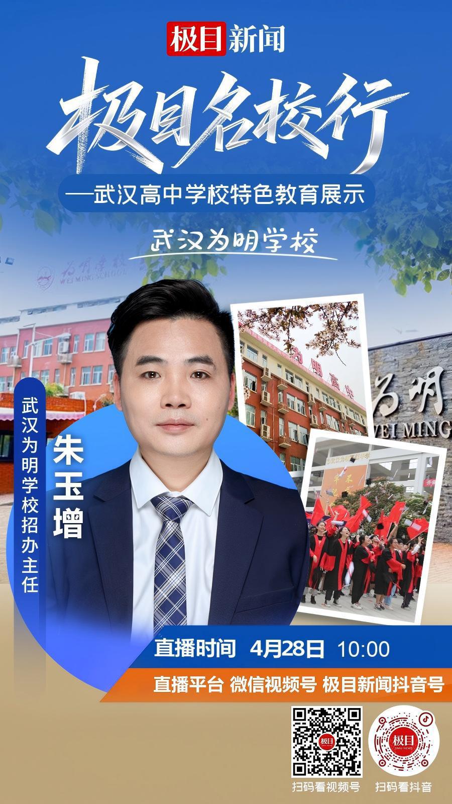 4月28日10:00,锁定新闻官方微信视频号、抖音、新闻客户端直播间,武汉为明高级中学招办主任朱玉增将带领大家走进小学部、初中部、高中部、国际部,介绍为明高中招生班型,签约政策,高中奖学金,志愿填报技巧等,分享学校在“打造为明新课堂 低进高出 高进优出 优进特出 多元开花”“推进特色办学,实现多元发展”等方面的探索实践。