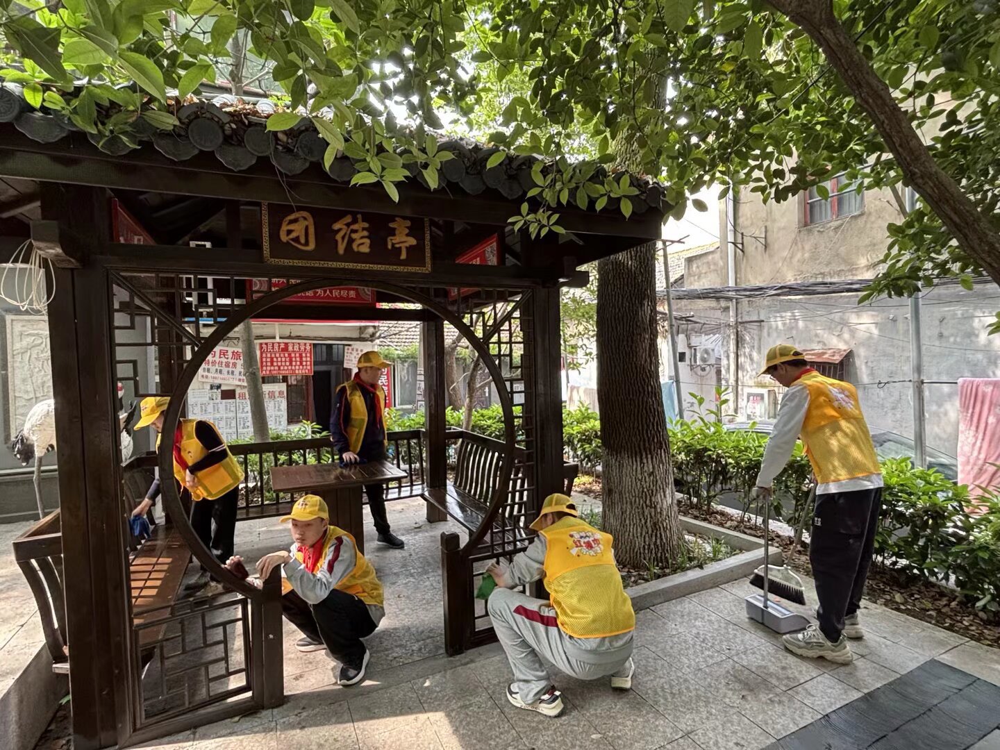 七年级学生走进西厂口社区,成了主动服务的“小志愿者”。腼腆的小晨(化名)一遍遍踮起脚尖,把抹布按在凉亭横梁上,连缝隙里的灰尘都不放过。平时爱打闹的俊俊抢过扫帚,把砖缝间的碎叶用指甲抠出来。负责浇水的小诤蹲在大树边,连角落里的小草也没落下。看着焕然一新的社区,孩子们脸上露出亮堂堂的笑容。