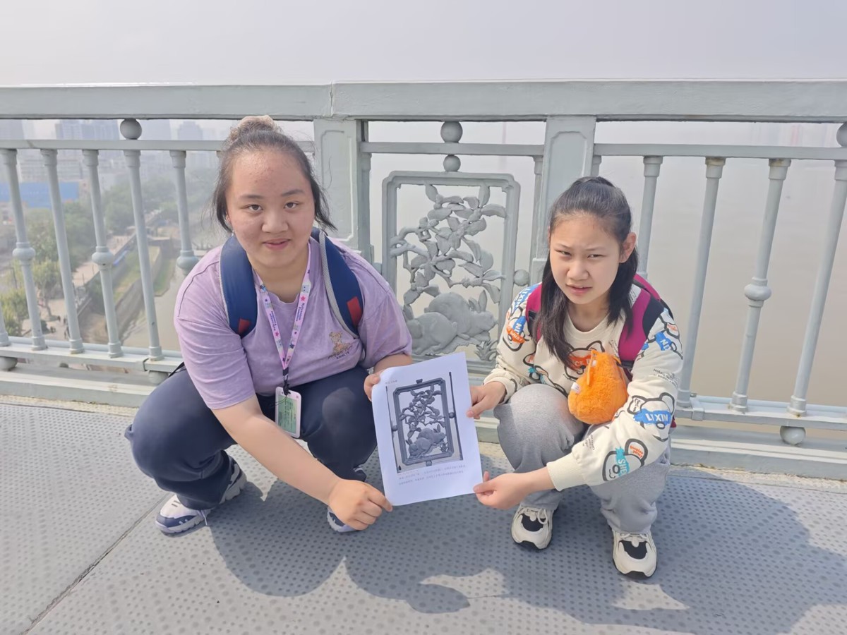 中职年级学生步行至武汉长江大桥,带着“文化任务单”,寻找桥身栏杆上的凤凰展翅、百合蝉鸣等雕花图案。曾经让老师头疼的“小顽童”小范,这次没有乱跑。他捧着图纸逐一比对铸铁纹样,轻轻触摸,认真记录,最先找到凤凰展翅图。途中他主动接过同学沉重的背包,小心搀扶行动不便的同伴,默默捡起路边垃圾,全程严守纪律。研学结束后,孩子们还用螺钿工艺和雕花剪纸创作了凤凰与黄鹤楼作品。