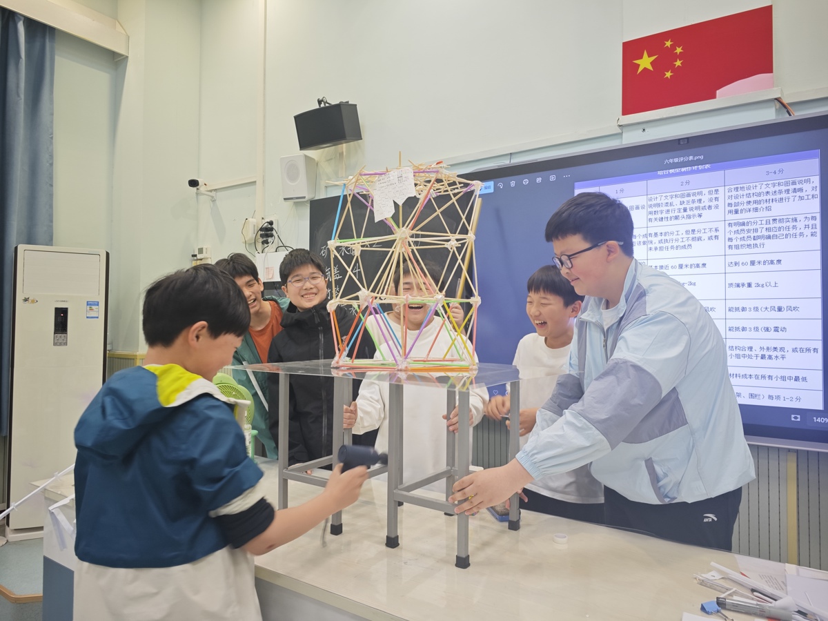 一(1)班参赛学子余婧妍感触颇深:“刚开始搭的塔总是晃来晃去,后来我和搭档一起加宽底座、找准平衡,塔就稳稳站住了!亲眼看着作品顺利通过所有测试,心里特别自豪,也真正感受到了动手做科学的快乐。”