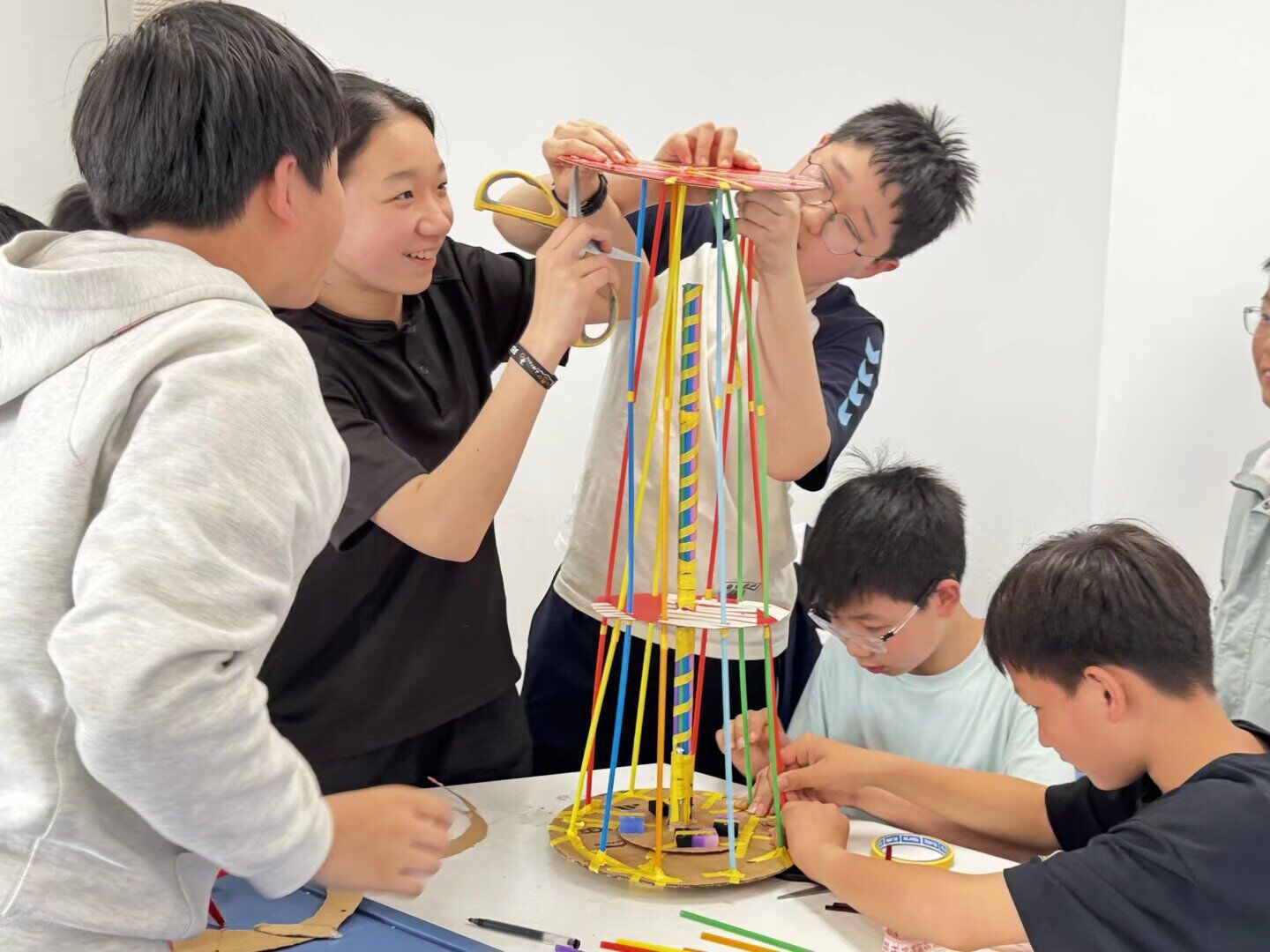 本次大赛年级赛道特色鲜明、干货十足:一二年级萌娃化身“云朵建筑师”,用纸棒、彩泥比拼塔台稳固度;三四年级学子变身“纸尖创想家”,单张A4纸挑战高度与平衡双重极限;五年级专职“桥梁工程师”,匠心设计纸桥硬核比拼承重能力;六年级组队成为“塔台指挥官”,聚焦重心调控、塔基加固,协作构筑稳固立体结构,沉浸式体验真实工程搭建全过程。