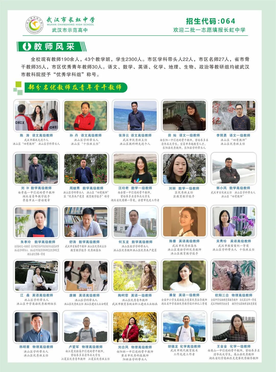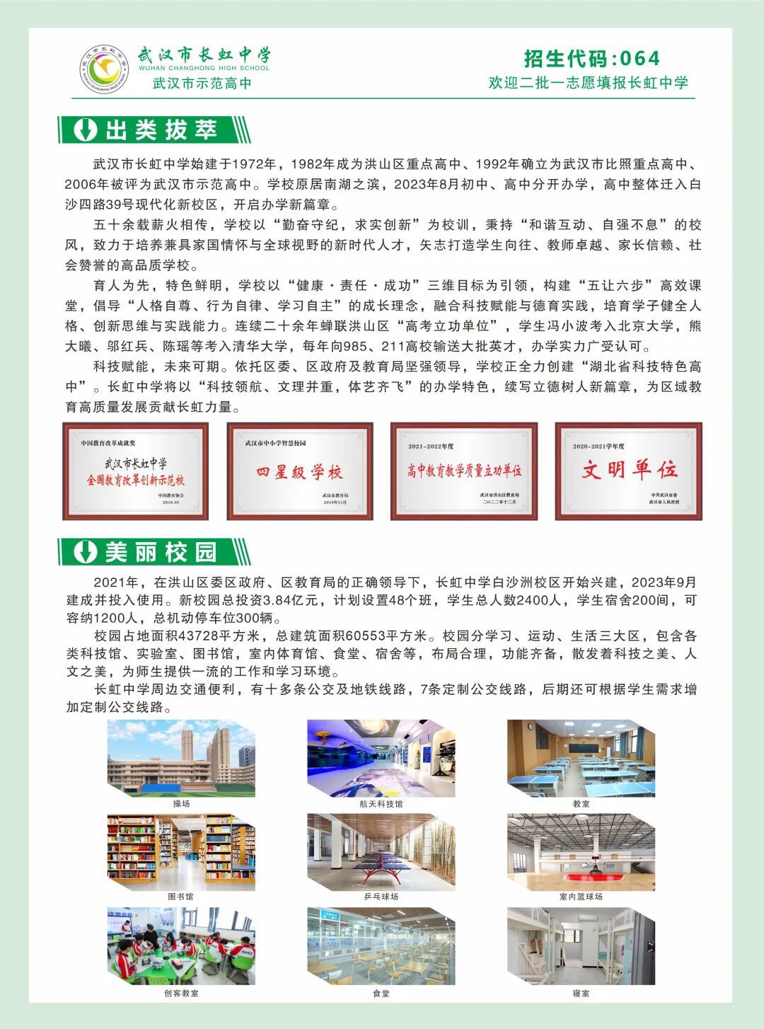 长虹中学创建于1972年,1982年确立为洪山区重点高中,1992年确立为武汉市比照重点高中,2006年被评为武汉市示范高中。学校原居南湖之滨,2023年8月,初中、高中分开办学,高中整体迁入白沙四路39号现代化新校区,开启办学新篇章。学校现有教师190余人,43个教学班,学生2300人。
