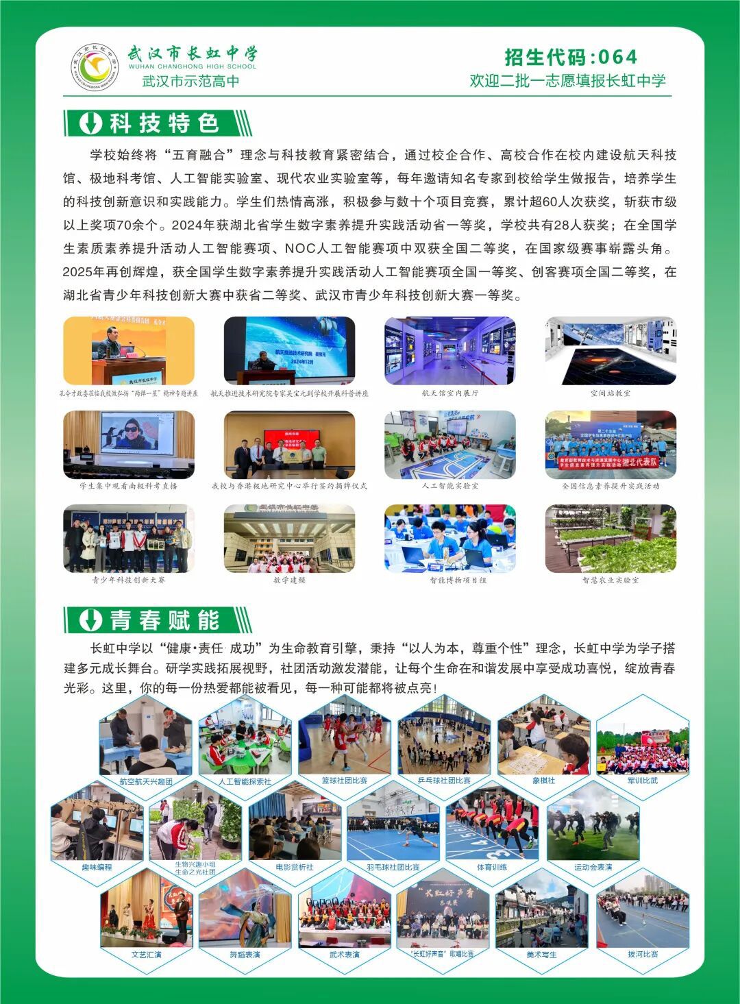 4、办学特色显:学校始终将“五育融合”理念与科技教育紧密结合,通过校企合作、高校合作在校内建设航天科技馆、极地科考馆、图书馆、人工智能实验室、现代农业实验室等,每年邀请知名专家到校给学生做报告,培养学生的科技创新意识和实践能力,弘扬爱国主义精神和科学家精神。在2024 年湖北省数字素养大赛中,学校共有28人获奖,其中两名学生代表湖北省参加2024年全国数字素养大赛,获全国“一等奖”、创客赛项全国“二等奖”。在2025年1月举行的国际高中数学建模竞赛(HIMCM)中,学校共有21名学生获奖,其中三个小组斩获“二等奖”,三个小组荣获“三等奖”。在湖北省青少年科技创新大赛中获省二等奖、武汉市青少年科技创新大赛一等奖。