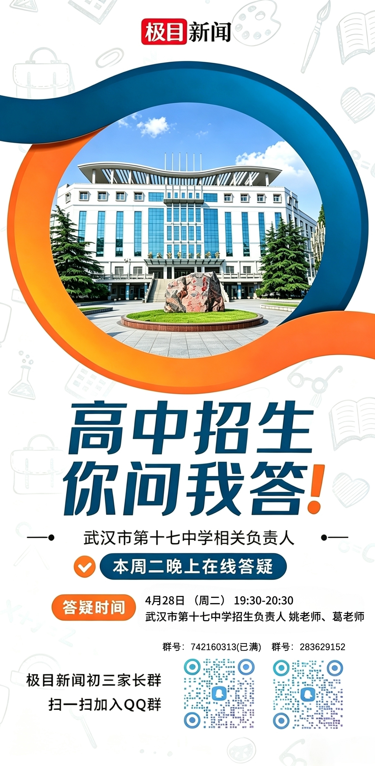4月28日19:30至20:30,在新闻两个初三家长群里,进行武汉市第十七中学专场线上答疑。届时,该校招生老师将实时解答家长疑问。(1群已满,2群群号为:283629152)