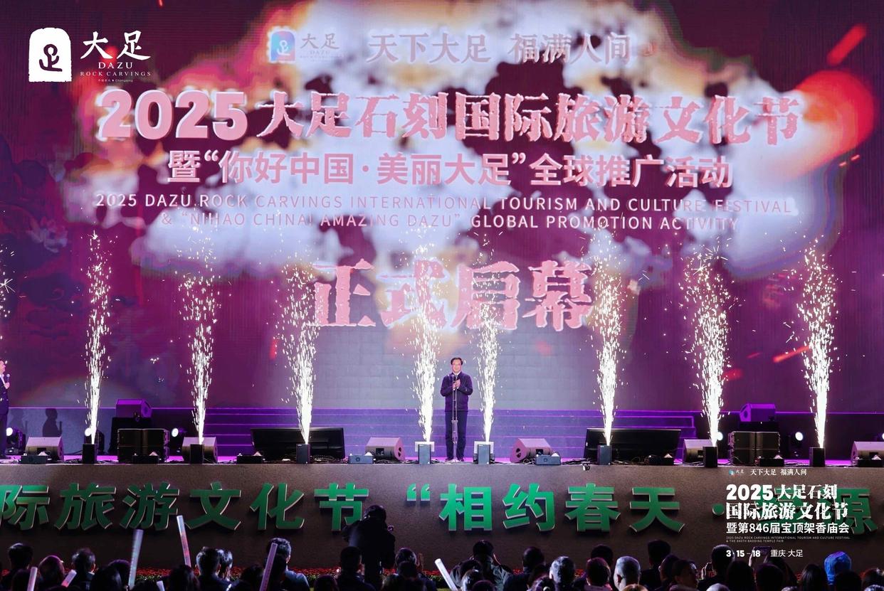 3月15日,2025重庆大足石刻国际旅游文化节暨第846届宝顶架香庙会在大足启幕,活动持续至3月18日。重庆市人大常委会副主任沈金强出席并宣布开幕。活动旨在汇聚行业智慧,探讨文旅发展新趋势,分享经验做法,共谋发展新篇,切实提升大足文旅的全球知名度和品牌影响力,吸引国内外游客走进大足、感悟大足、触摸大足。