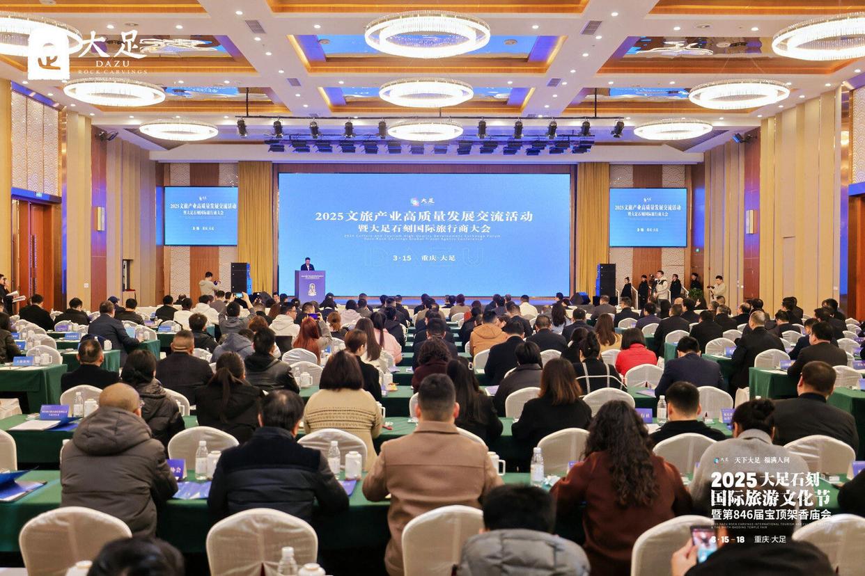 作为本届旅游文化节的重要内容,2025文旅产业高质量发展交流活动暨大足石刻国际旅行商大会由中国旅游报社、大足区人民政府主办,大地风景文旅集团支持。会上,主办方就大足文旅资源作系统推介,发布《2025年大足石刻景区、龙水湖度假区旅游团队营销奖励办法》。签约仪式环节,大足区与5家文旅企业签约。主旨演讲环节,专家学者分别围绕“一老一小,文旅需求与产品供给”“打造文旅消费新场景”等主题进行演讲。当日,主办方还组织召开座谈会,专家学者就大足建设国际文旅名城提出意见建议。