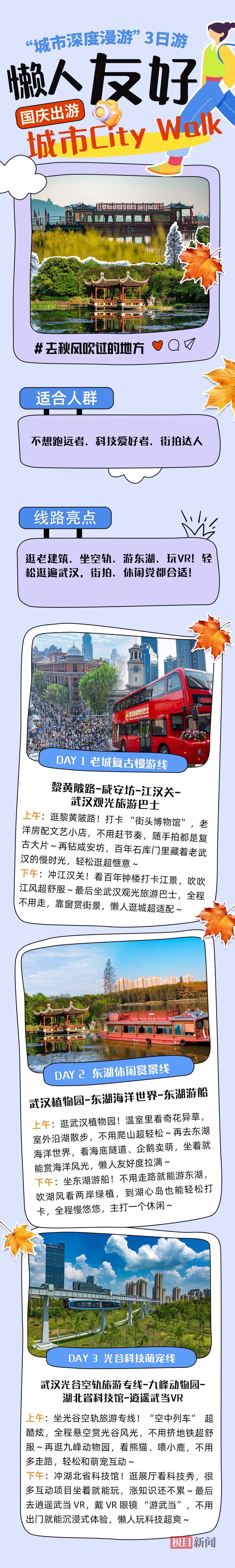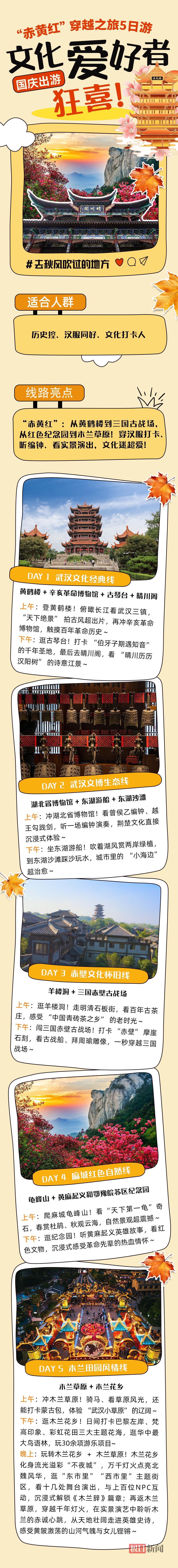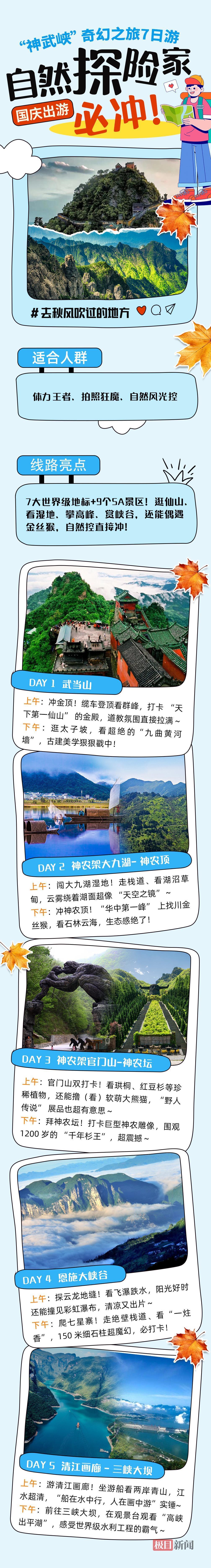 为方便规划行程,湖北文旅特别推荐了三条国庆主题旅游线路,分别是为期七天的“神武峡”奇幻之旅、五天的“赤黄红”穿越之旅以及三天的城市深度漫游之旅,以适应不同时长与兴趣的出行需求。
