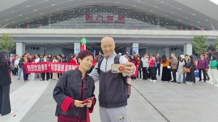 当天早上不到8点,荆门游客就早早地来到荆门西站广场打卡留念。荆门市老年大学老师易吉敏今年69岁。她介绍,前几天听说襄荆高铁开通的消息就很想到襄阳去旅游,在媒体上看到荆门当地旅行社组织“襄荆高铁千人专列”的消息后,就带着老年大学的15人组团报名参加。