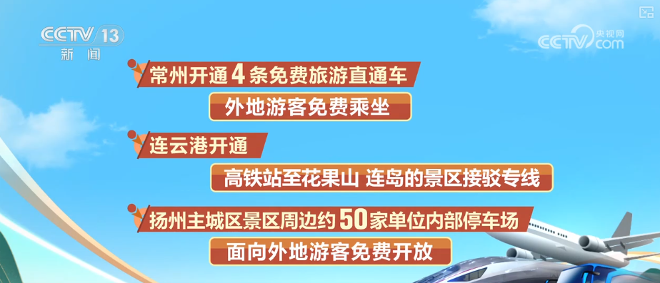 节日期间,江苏还有多项惠民措施。常州开通4条免费旅游直通车,对外地游客实行公共交通免费乘坐政策;连云港开通高铁站至花果山、连岛的景区接驳专线;扬州面向外地游客免费开放主城区景区周边约50家单位的内部停车场;盐城市区原有道路收费类停车位万余个全部免费,新增2条免费旅游公交专线和2条景区直通车旅游专线。
