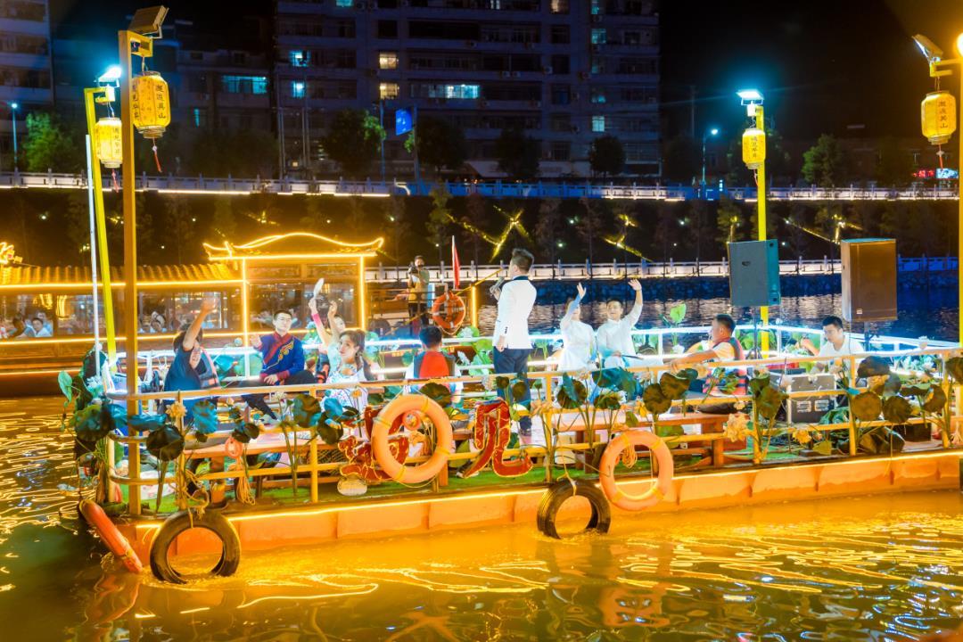“印象英山·遇见毕昇”一河两岸特色夜游在城区启动,国庆期间游客可乘坐画舫游船或金龙竹筏,欣赏音乐喷泉秀、水幕电影、激光秀、灯光秀以及时空隧道等景观,观看黄梅戏《毕昇》选段等沉浸式演出,还有非遗火壶、打铁花、非遗风火轮、烟花瀑布等表演震撼上演。