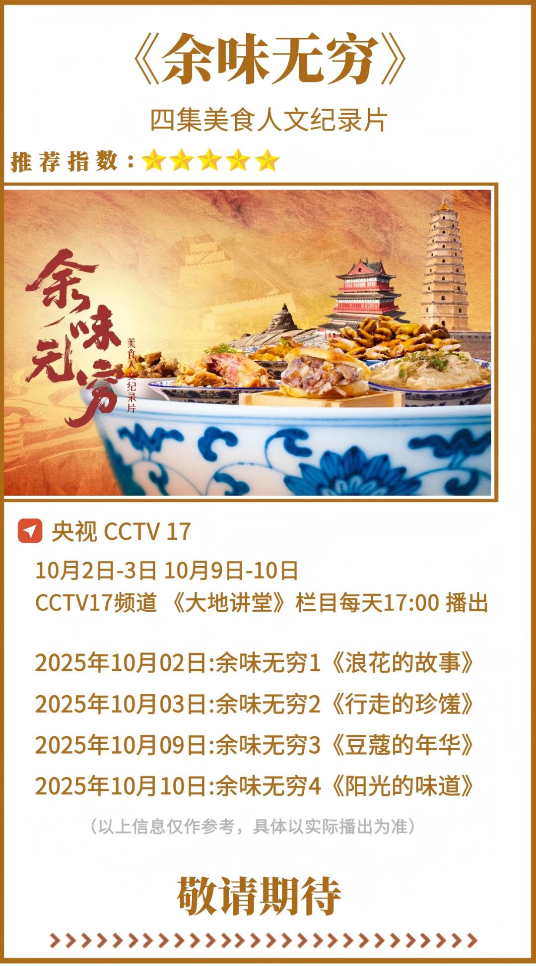 新闻记者获悉,由中共榆林市委宣传部、榆林市文化和旅游局联合指导出品的美食人文纪录片《余味无穷》,将于10月2日-3日、10月9日-10日在央视CCTV17频道《大地讲堂》栏目播出。全片共4集,以“原产地”为叙事核心,以美食为流动线索,开启一场从“舌尖”到“心尖”的塞上文脉之旅。