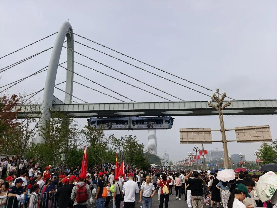 8时许,武汉光谷高新大道光谷空轨站下,不少来看花车巡游的游客挥舞国旗,争相和光谷空轨合影。