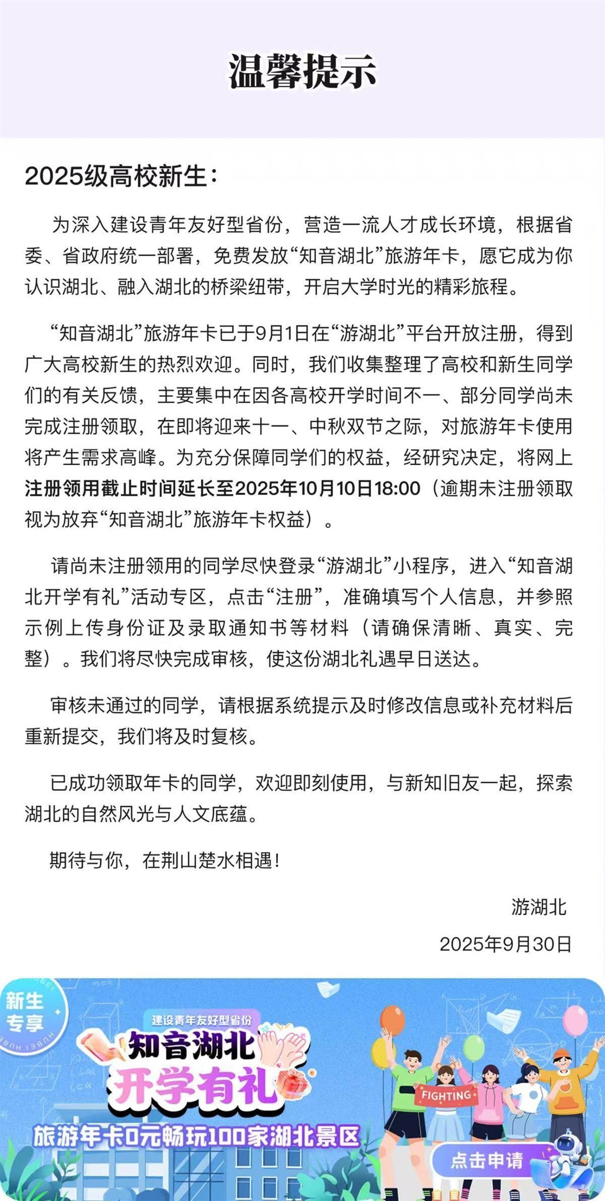 为充分保障2025级高校新生权益,让更多新生能顺利领取“知音湖北”旅游年卡,开启在湖北的精彩探索之旅,9月30日,“游湖北”平台发布重要通知,将原定9月30日关闭的“知音湖北”旅游年卡网上注册领用通道截止时间,延长至2025年10月10日18:00,逾期未注册领取将视为放弃该权益。