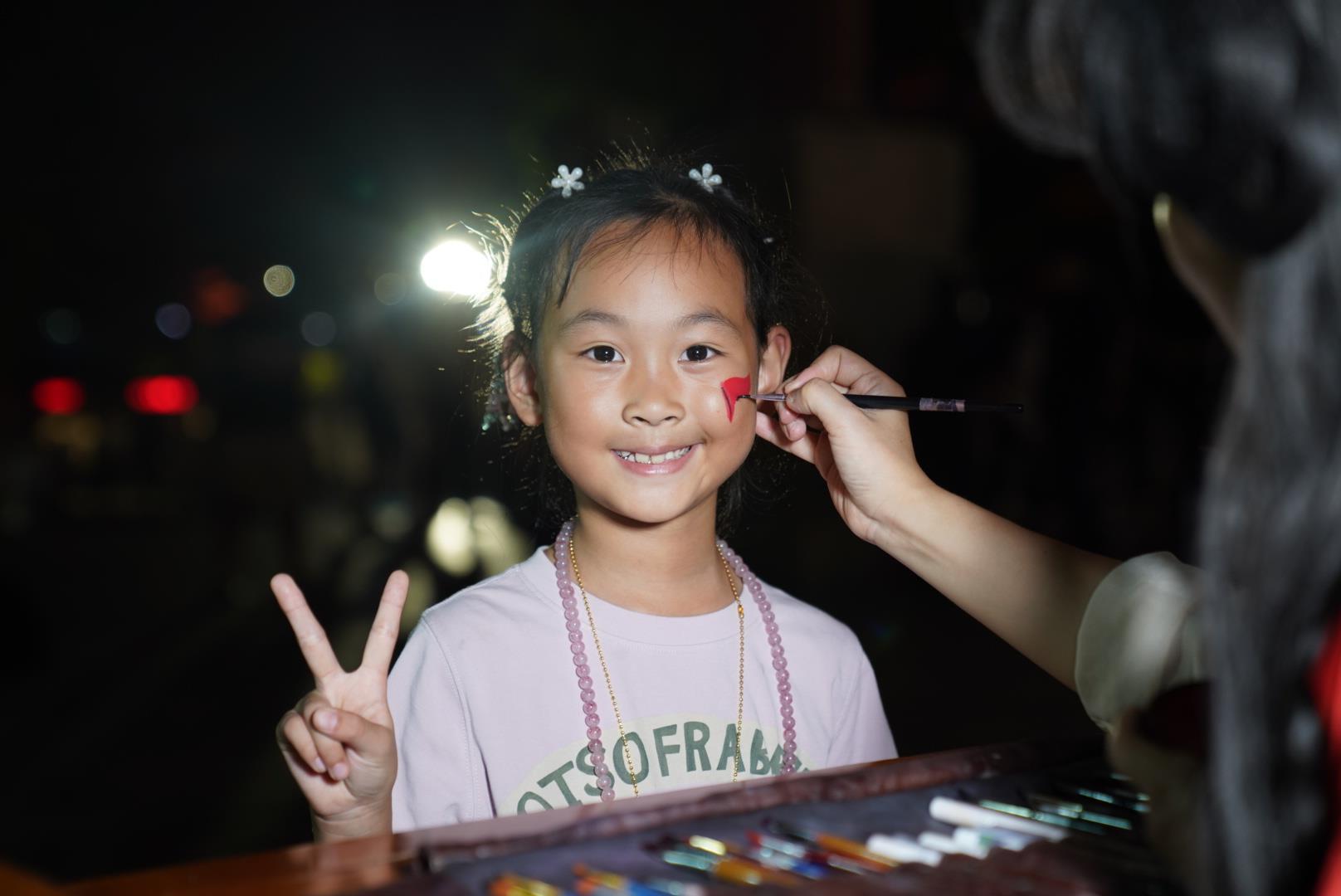 国庆主题点妆活动区,大家有序排队,期待着工作人员用灵巧的笔触,在他们的脸颊上描绘出五星红旗、“中国心”等图案。“这个活动特别有仪式感!”带着孩子前来体验的市民刘女士说,“一笔一画不仅是节日的装饰,更是一颗爱国的种子,悄悄种在了孩子心里。”