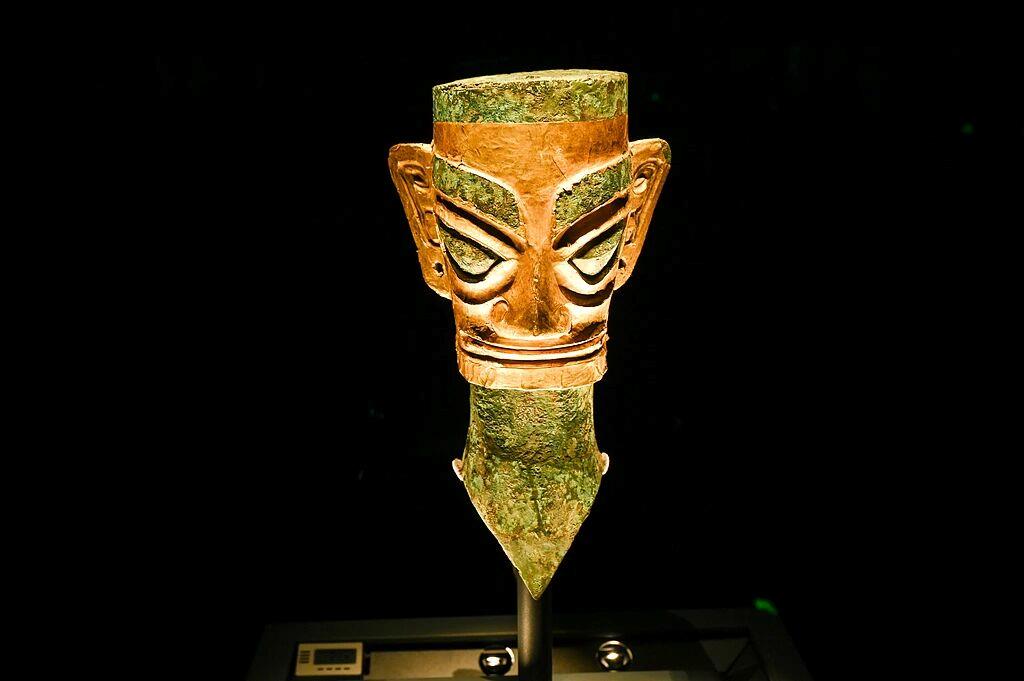 标志性的大粗眉、蒜头鼻,灵感正来自四川广汉三星堆博物馆的戴金面罩青铜人头像和青铜大面具。