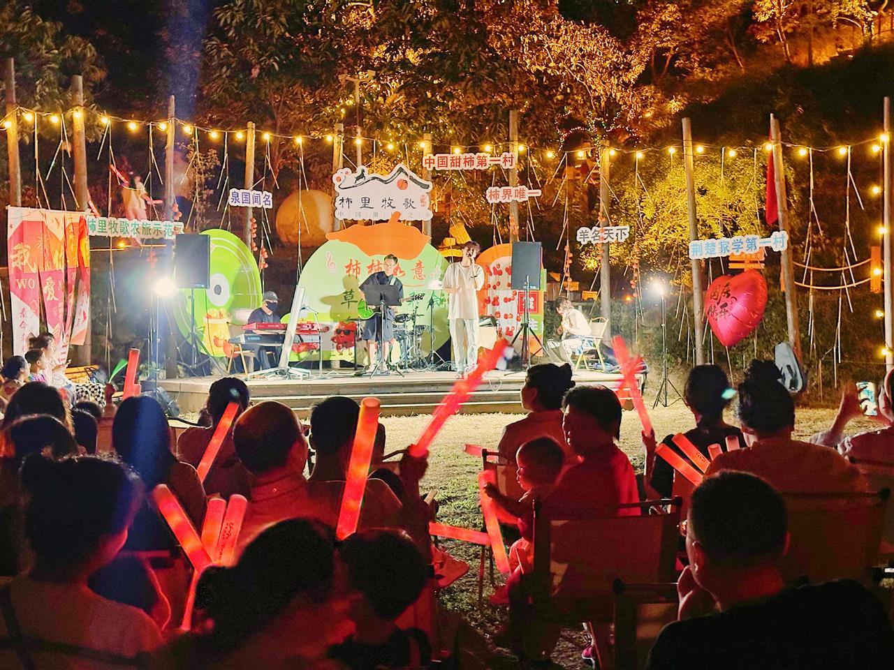 罗⽥县柿⾥牧歌农旅区晚上聚满游客