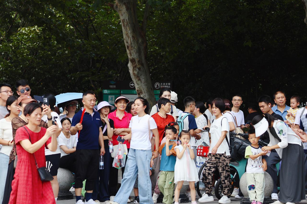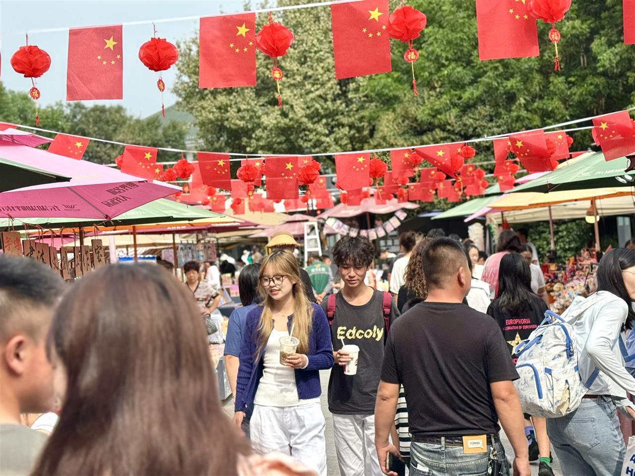 国庆假期,武汉东湖绿道湖光序曲广场上人潮涌动,多元融合的快闪表演与热闹非凡的国庆市集交织成一幅生动的假日画卷,让来自四面八方的游客沉浸在欢乐的节日氛围中。