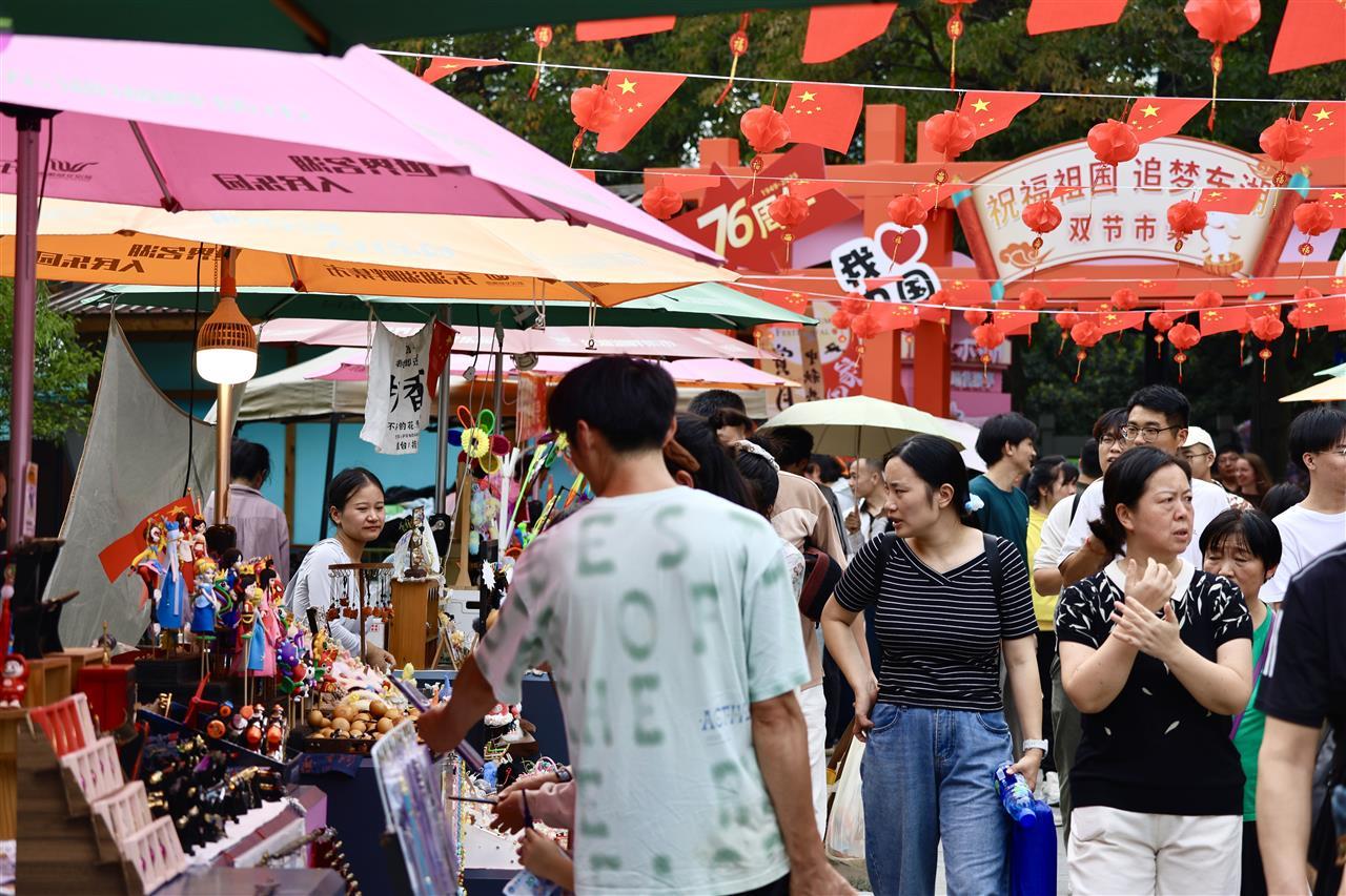 广场另一侧,国庆市集人声鼎沸。与往年相比,今年的美食板块明显扩容,各色小吃摊位前排起长队。武汉热干面、陕西肉夹馍、台湾蚝蛋烧等特色美食备受青睐。带着全家前来游玩的市民陈先生表示:“今年市集上的美食选择挺多的,从各地特色小吃到创意甜品应有尽有,让人大饱口福。”