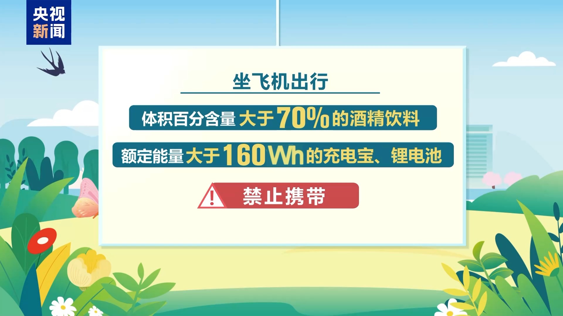 坐飞机出行,体积百分含量大于70%的酒精饮料,额定能量大于160Wh的充电宝、锂电池也禁止携带。