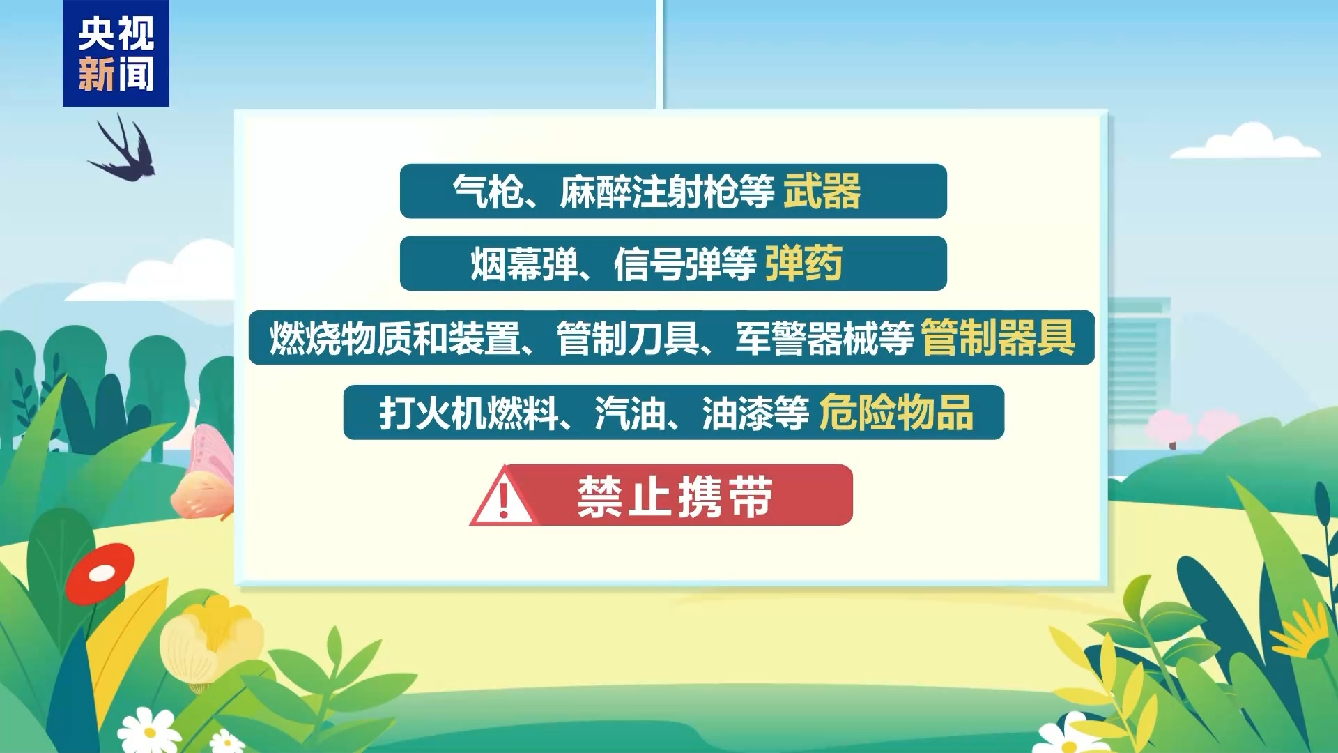旺盛的假日出行需求下,带着大包小包出行的旅客,尽量提前检查行李。气枪、麻醉注射枪等武器,烟幕弹、信号弹等弹药或者燃烧物质和装置、管制刀具、军警器械等管制器具,打火机燃料、汽油、油漆等危险物品禁止携带。
