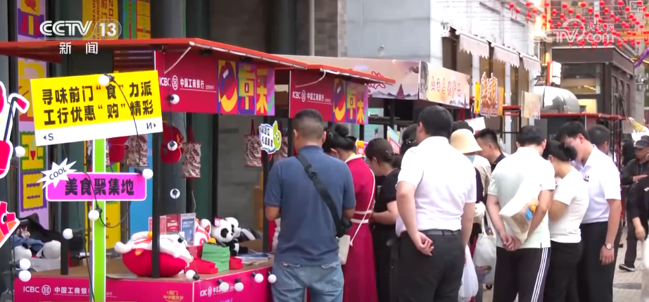 除政府消费券外,各大银行的满减活动力度同样可观。假期第一天,在前门,各地美食好物汇集,游人络绎不绝。