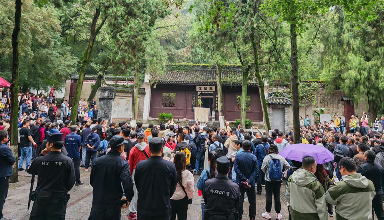 烟雨朦胧中,来自全国的游客们跟随刘关张的脚步,齐声高呼“先生请出山”,场面十分壮观。