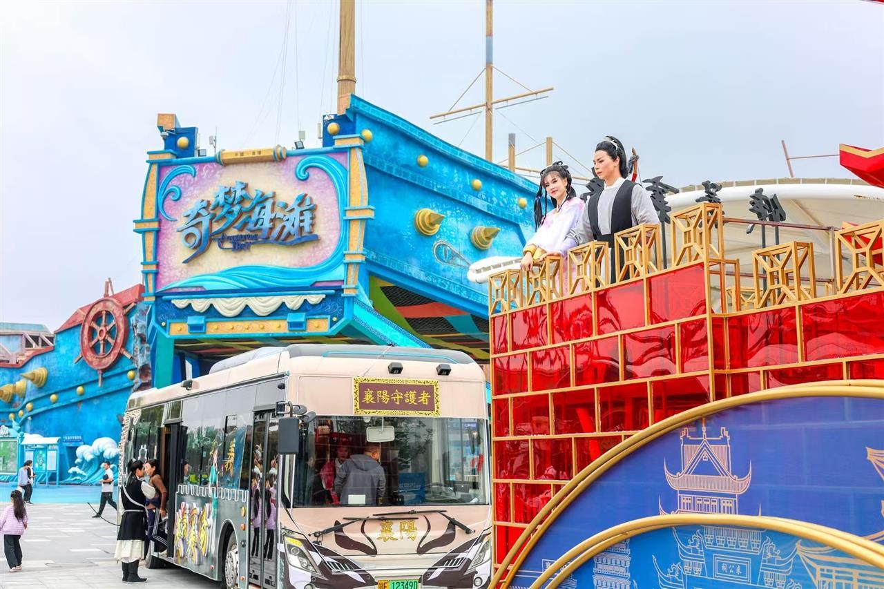 花车一下高速,便直奔襄阳市公交五公司,与静候已久的郭靖黄蓉主题公交车首度“会师同框”。这辆花车不仅是一场视觉盛宴,更是一座流动的“侠义精神博物馆”:车顶以传统斗拱榫卯工艺打造的巨型“襄”字,每一处咬合都凝结着匠心坚守,呼应着襄阳人世代相传的执着风骨;车身两侧,金属框架勾勒出汉江的连绵波涛与古城墙的雄浑轮廓,青灰仿石质感沉淀岁月沧桑,而现代金属的光泽又为其注入时代活力,恰如“铁打的襄阳”,既承袭历史厚重,又不断焕发新生。