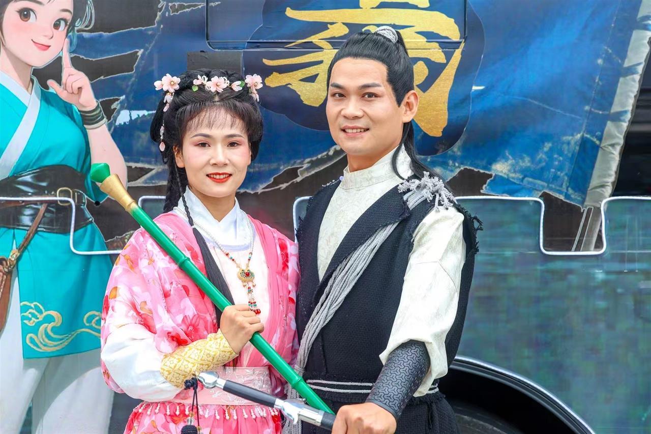 为了让“侠义精神”从视觉符号转化为可感可触的情感体验,襄阳市文旅局特邀在武汉巡游中亮相的郭靖、黄蓉扮演者亲临现场,与公交版郭靖黄蓉惊喜同台:花车之上,古装“靖蓉”凭栏远眺,目光坚定,仿佛仍在守护这座千年古城;公交车旁,另一组“靖蓉”则复刻83版剧中经典动作,两组角色遥相呼应,将文学中的侠义场景真实再现于眼前。