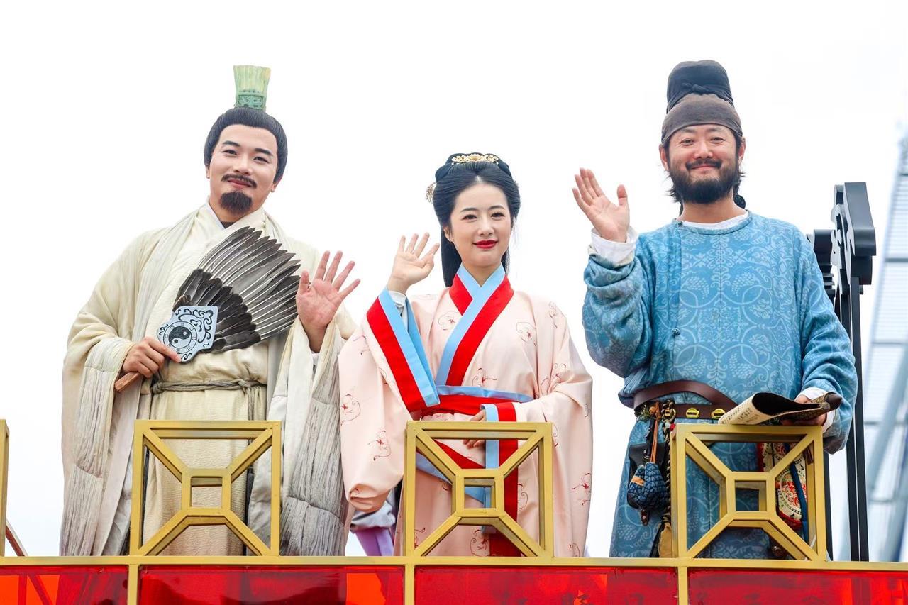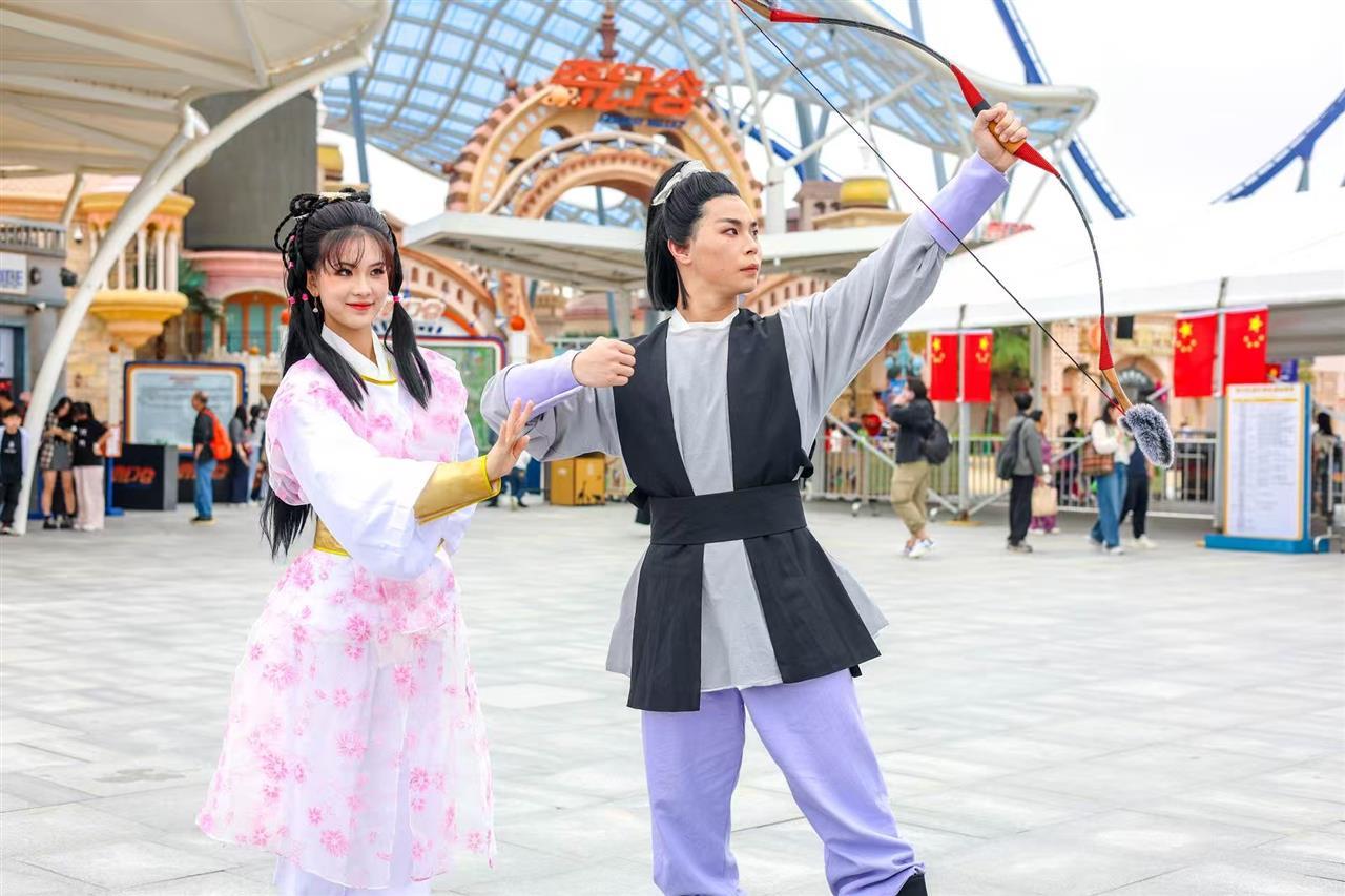 现场更是掀起一阵阵“侠义风暴”:襄阳F4组合带来荡气回肠的古风表演,华侨城“超级小飞侠”惊喜现身,与孩子们欢乐互动,唐城NPC们身着古装穿行于人群之间,与花车、演员共同编织出一幅流动的武侠画卷。花车、演员、游客、演出——在此刻交融,营造出沉浸感十足的江湖场景,让人仿佛一步踏入金庸笔下的快意恩仇之中。