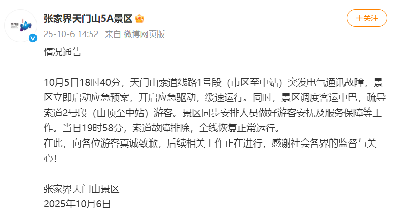 10月5日18时40分,天门山索道线路1号段(市区至中站)突发电气通讯故障,景区立即启动应急预案,开启应急驱动,缓速运行。同时,景区调度客运中巴,疏导索道2号段(山顶至中站)游客。景区同步安排人员做好游客安抚及服务保障等工作。当日19时58分,索道故障排除,全线恢复正常运行。