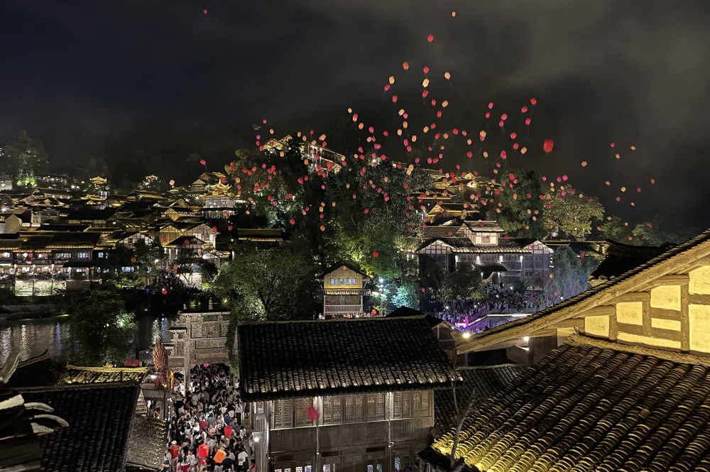 入夜,无人机阵列在空中排开,中秋无人机烟花秀开启。当“欢庆国庆”的字样在空中显现,风雨桥与吊脚楼里的游客纷纷举起手机拍摄。随着音乐流转,多彩焰火与无人机表演交织,在现代科技加持下,火树银花的盛景赢得阵阵赞叹。