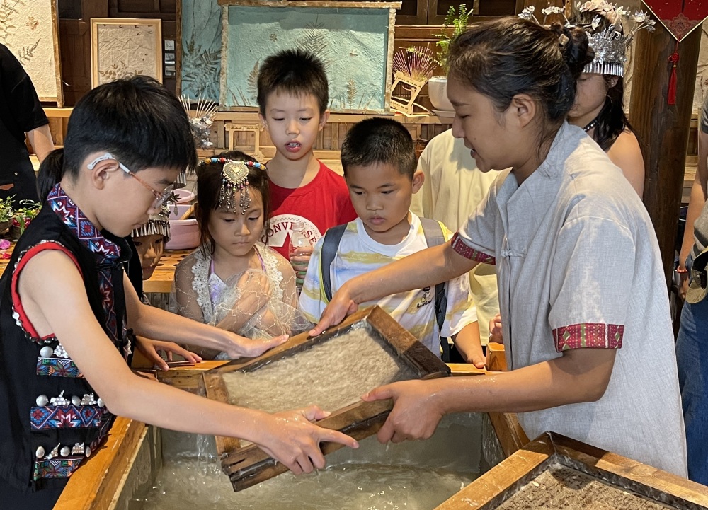 广东中学生陈晓宇在指导下,将竹帘浸入纸浆池,捞出薄如蝉翼的纸胚,兴奋地说:“原来纸是这么做的,亲手做特别有趣!”作坊还创新推出花草纸体验,家长与孩子一起铺上花草,制作独一无二的工艺品。