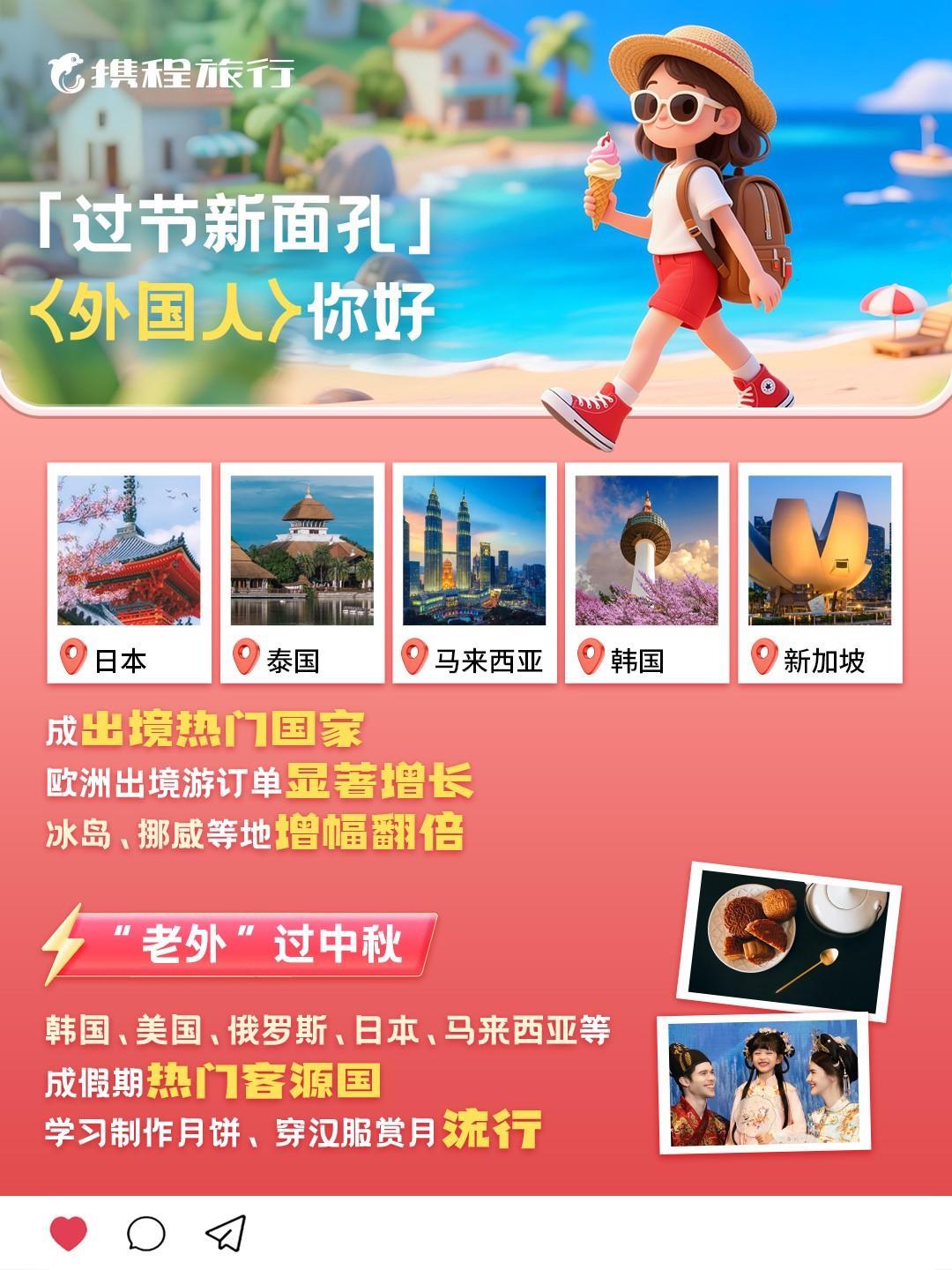 出境方面,日本、泰国、马来西亚、韩国、新加坡等国家凭借距离近、签证政策便利等优势,成为中国游客首选。欧洲深度游也备受青睐,携程数据显示,冰岛、挪威等地出境订单增幅同比翻倍,西班牙、意大利、德国等地增幅约七成。