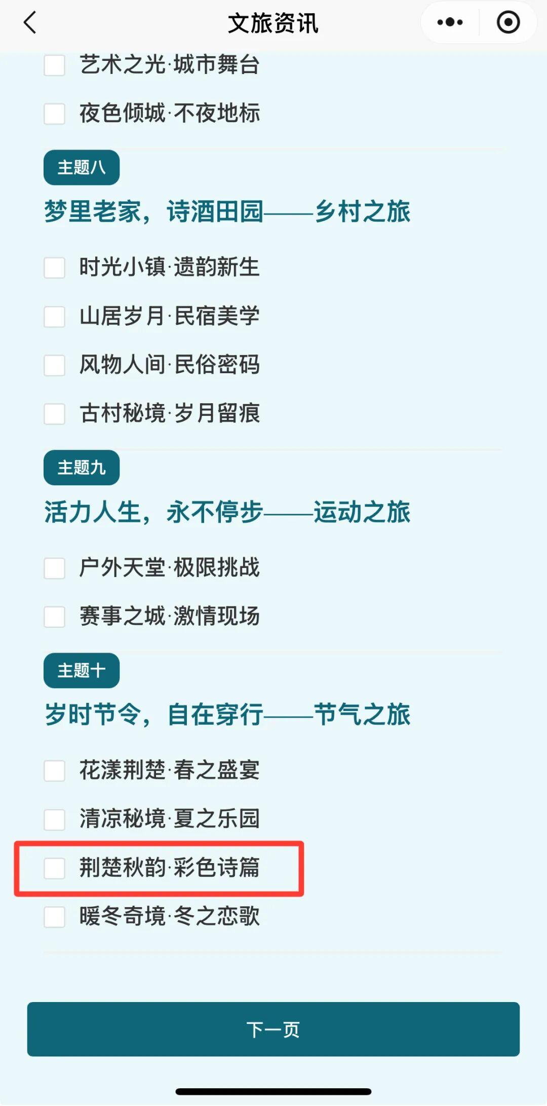 进入页面后点“点击上传”,勾选 “彩林漫舞・秋之诗篇”主题词(可同时勾选其他主题词),选完点击“下一页”。
