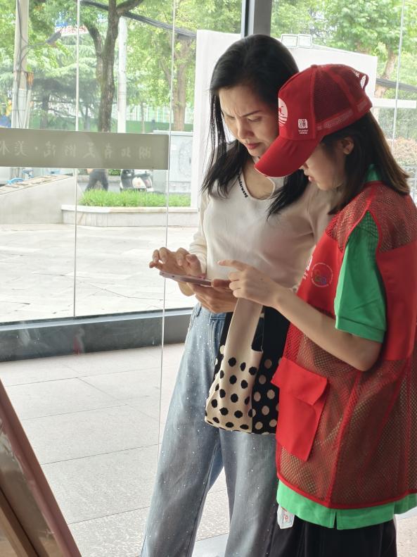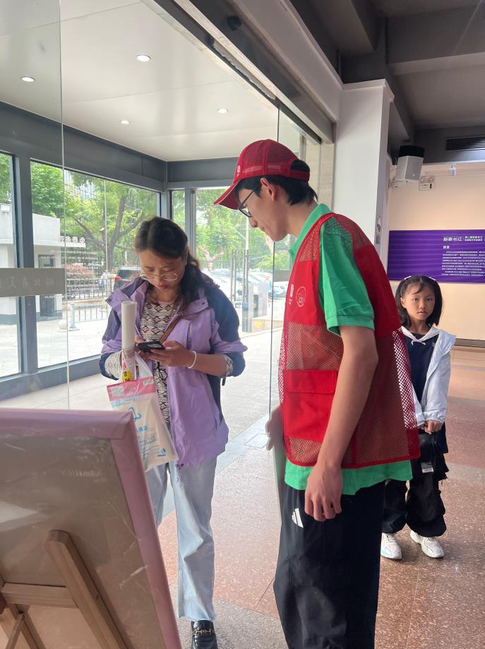志愿者早早来到现场,协助观众扫码预约入场,温馨提醒大家不要把食物饮料带进展馆,不要用手触摸展品。