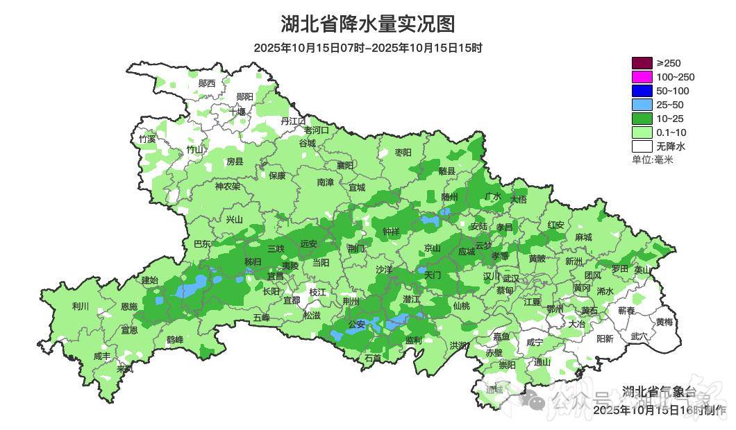 10月16日08时-17日08时,鄂西北、鄂西南阴天有中到大雨,局地暴雨;江汉平原、鄂东北西部阴天有小到中雨,局地大雨;其他地区阴天有小雨。最高气温鄂东南22~25℃、其他地区18~22℃,最低气温16~21℃。偏北风2到3级、阵风4到5级。