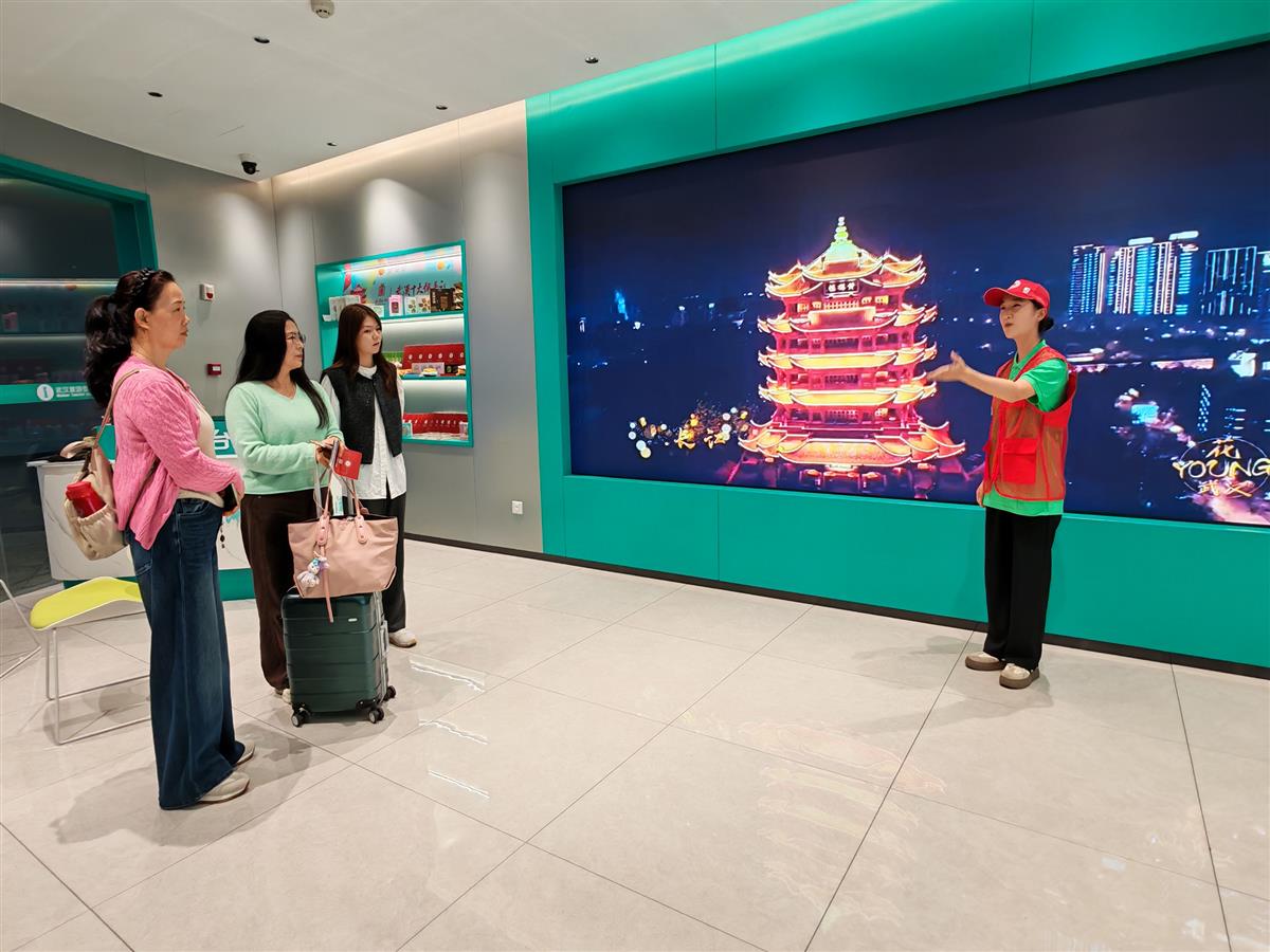 此外,志愿者们还化身武汉文化讲解员,咨询点里的临时讲解区域不时围满游客。志愿者陈世荣指着大屏幕上的黄鹤楼,声音洪亮又富有感染力:“‘昔人已乘黄鹤去,此地空余黄鹤楼。’黄鹤楼因唐代诗人崔颢的这首诗名扬四海,和湖南的岳阳楼、江西的滕王阁并称为‘江南三大名楼’。”她一边说,一边用手指着黄鹤楼上的飞檐细节进行讲解,身旁几位来自河南的游客听得入神,不时点头称赞:“原来这首诗写的就是它,这下知道为啥这么有名了!”