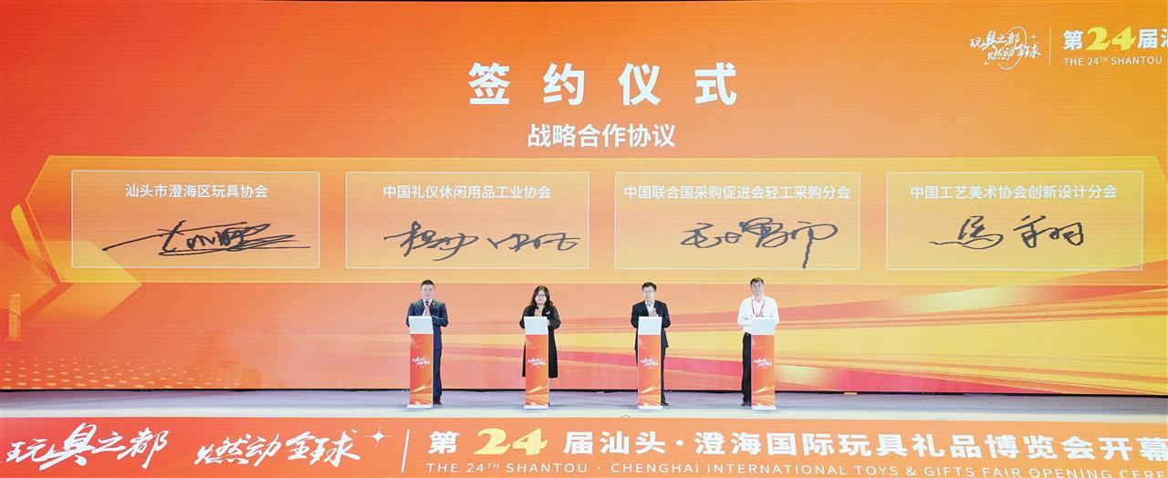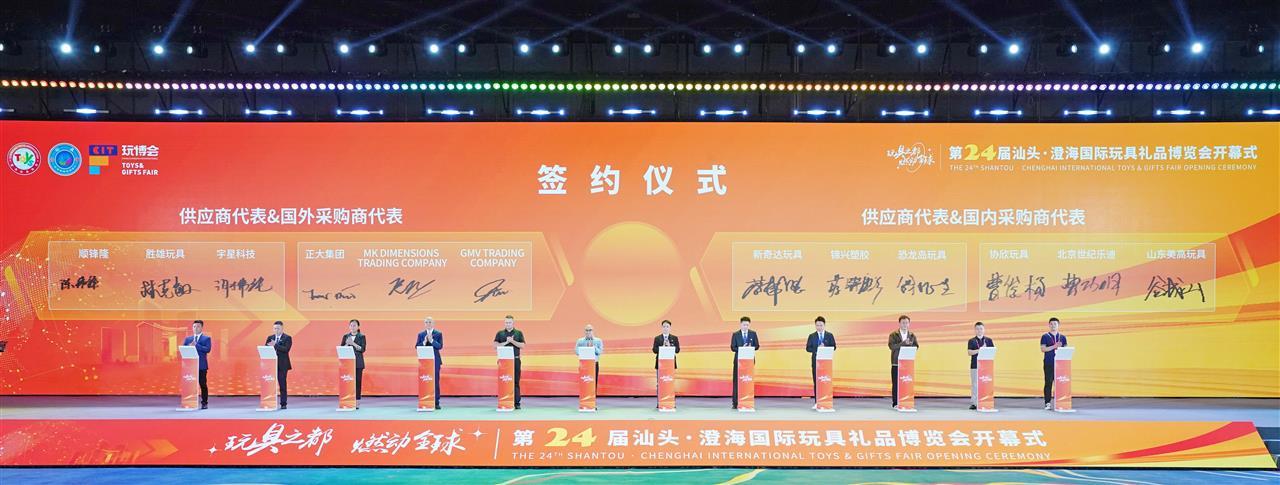 在签约环节,汕头市澄海区玩具协会、中国礼仪休闲用品工业协会、中国联合国采购促进会轻工采购分会、中国工艺美术协会创新设计分会签订了四方战略合作协议,共同推动行业设计人才培养、企业出海与国际市场拓展,实现互利共赢。泰国正大集团及来自美国、墨西哥等国外采购商代表,协欣、世纪美迪等国内采购商代表分别与本地供应商代表签订协议,总意向协议金额达到158亿元。