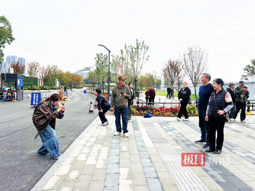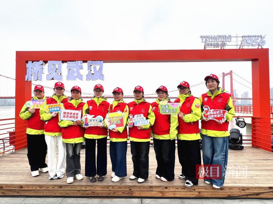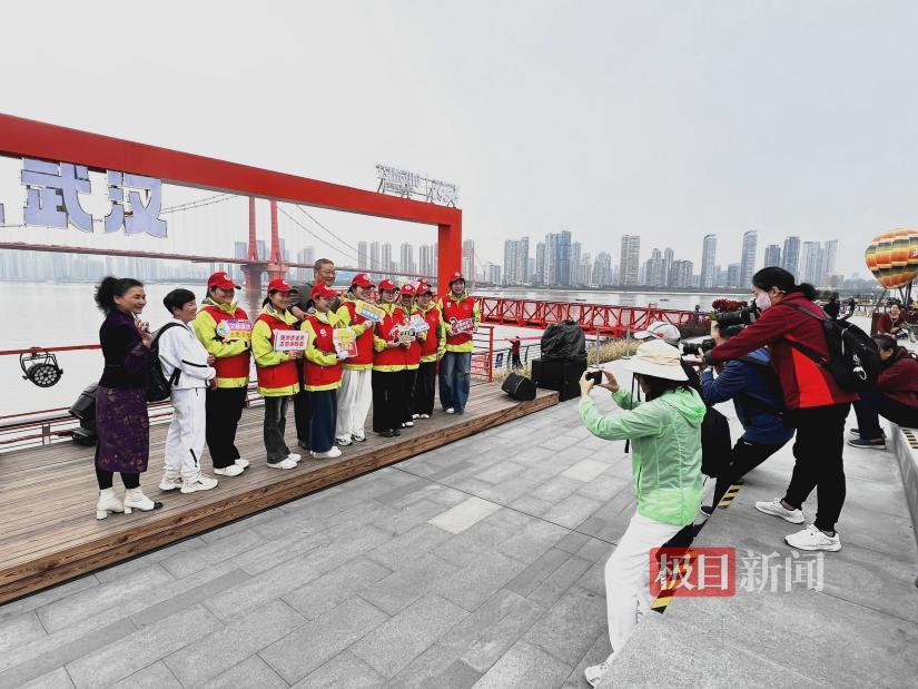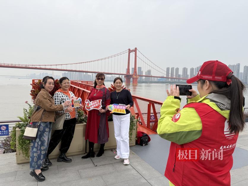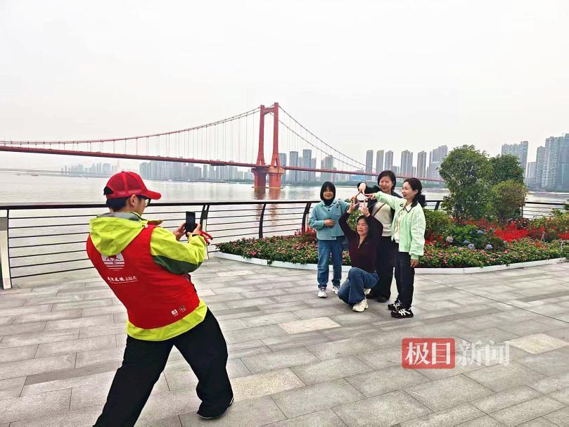 公园内移步皆景,浩荡的长江与橘红色的鹦鹉洲大桥构成天然画框,引得游客纷纷驻足拍照。志愿者们早已提前踩过点,对最佳拍摄角度了如指掌,他们既热心帮忙拍照,又主动提供指导。甚至活动还没开始,还没穿上统一服装,就已忙着帮游客拍照。