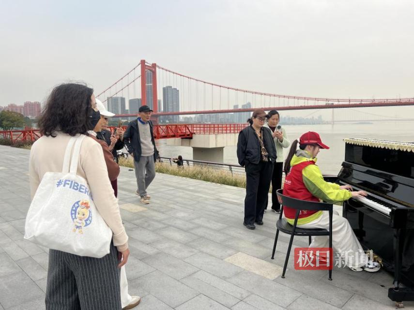 来自武汉音乐学院的志愿者易靖看到公园内放置有一架钢琴,便上前即兴弹奏起来,弹琴的剪影、流淌的旋律与奔流不息的长江相映成趣。这一幕,被游客们频频定格,工业遗产、红色文化与艺术灵感,为游客的照片增添了灵动意境。“大江大湖大武汉,我们在乐曲声、波涛声中听到了英雄城市的生生不息、蓬勃朝气。”不少游客动情地表示。
