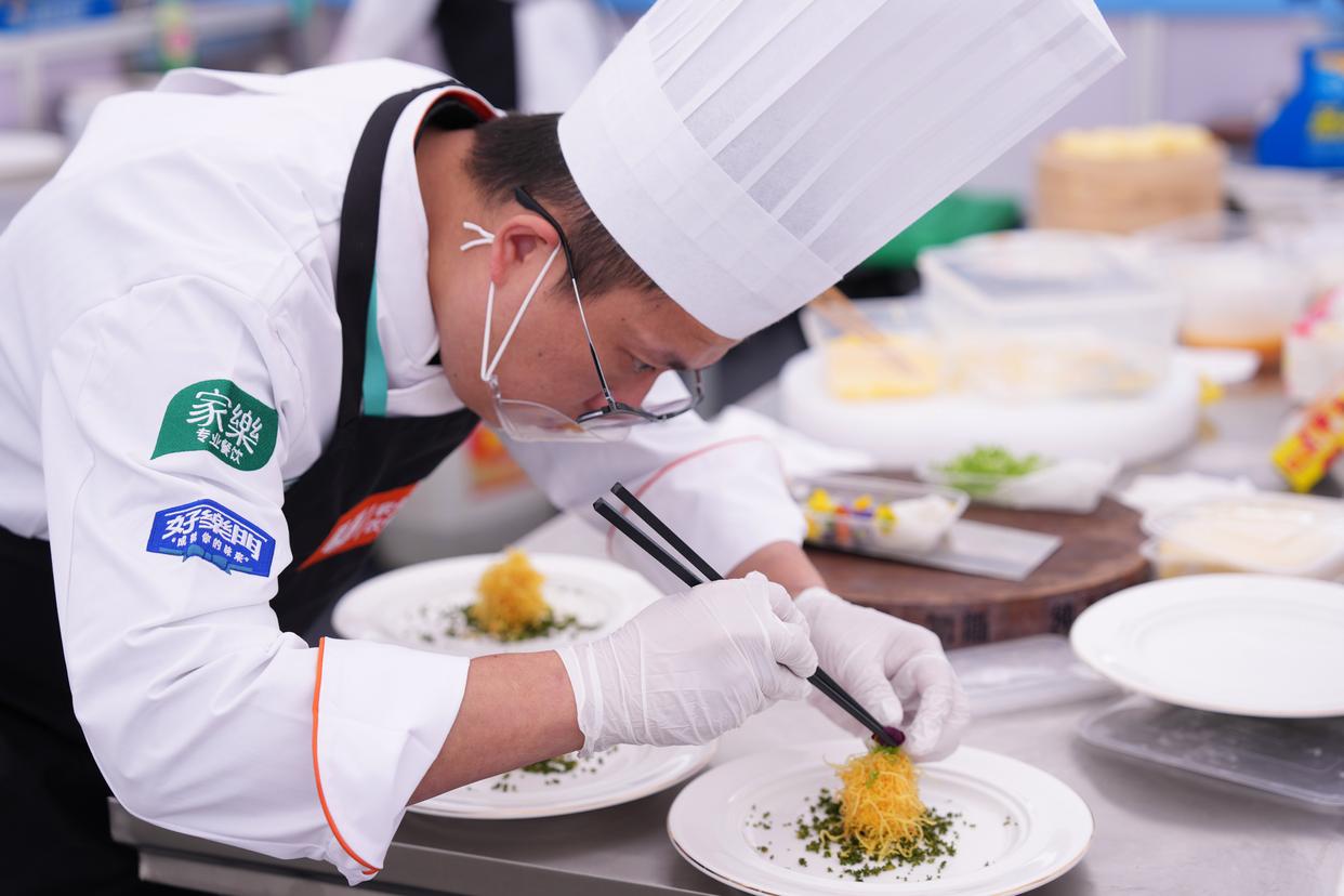 11月1日,参赛选手在2025世界川菜烹饪技能大赛上装饰餐盘。 新华社记者 胥冰洁 摄
