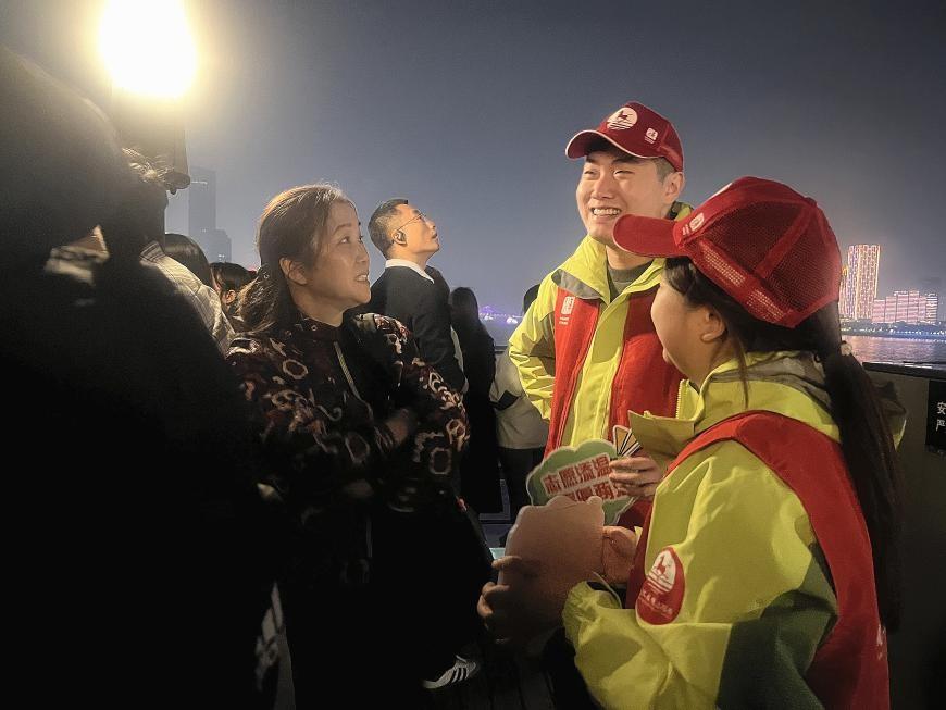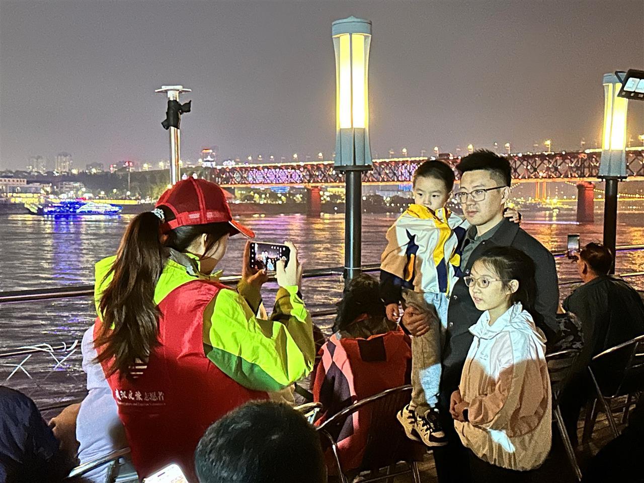 活动期间,游船缓缓前行,两岸的灯光秀不断变换色彩,光带倒映在江面上,像给长江系上了灵动的丝带。志愿者们的身影始终活跃在甲板、船舱各个角落:有人帮游客捡拾掉落的物品,有人提醒孩子不要乱跑,有人则围在游客身边,绘声绘色地讲着汉口开埠的历史故事。