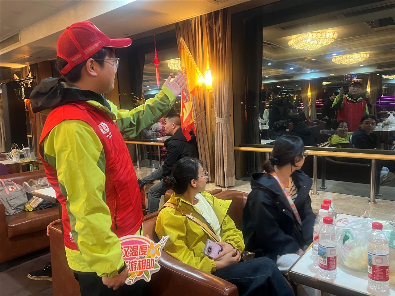 此时,一群身着醒目红马甲的文旅志愿者正快步穿梭在码头人群中,他们袖子上的“武汉文旅志愿者”LOGO在灯光下格外显眼。