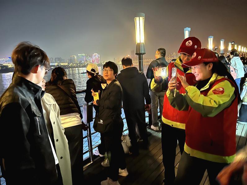 便民服务的场景更显温馨。上下船时,志愿者们都不忘提醒游客小心脚下,“奶奶您慢点,台阶有点滑,我扶着您。”“姐姐,你鞋带松了,赶紧系一下,免得把自己绊倒。”“您把孩子的手牵好,离栏杆远一点。”几位游客正对着江面美景想拍合影,志愿者朱琪悦见状立刻上前,接过手机熟练调整角度,“您往左边挪一点,把长江大桥的灯光框进去,这样拍出来更漂亮!”按下快门的瞬间,游客们的笑容与身后流光溢彩的江景一同定格。