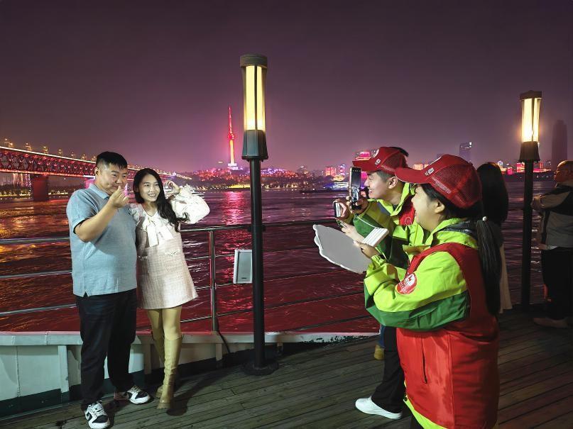 两江夜游早已凭借长江粼粼波光与两岸璀璨夜景,获评“湖北十大夜游目的地”“湖北省金秋十大目的地”,而志愿者们的身影让这份江景之美更添了几分人文暖意。