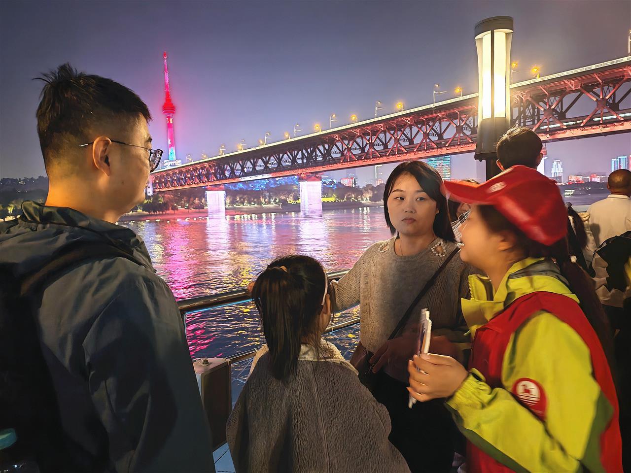 “本来只是来看夜景,没想到游船上有这么多志愿者,给我们讲了许多武汉文旅的故事,我还因此结识了同样来自外地的游客朋友,感觉这趟船坐得特别值!”来自湖南长沙的教师李女士和来自安徽合肥的一家四口,因为一同聆听志愿者的讲解而攀谈起来,继而成为朋友。“武汉文旅志愿者这种服务太有温度了,让我对武汉这座城市好感倍增!”
